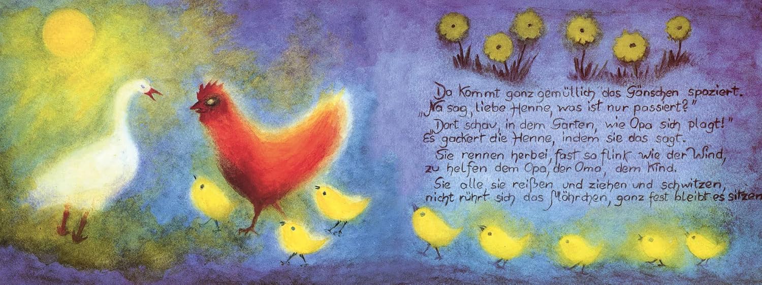 Die lustige Geschichte vom Möhrchen, das der Opa mit einer stets zahlreicher werdenden Reihe von Helfern aus der Erde ziehen will, erfreut immer wieder, Kinder beglückt es besonders, daß erst durch Mithilfe des kleinsten Tieres, hier der Ameise, die Möhre herausgezogen werden kann. Die handgeschriebenen Verse sind mit vielen farbigen Bildern illustriert.