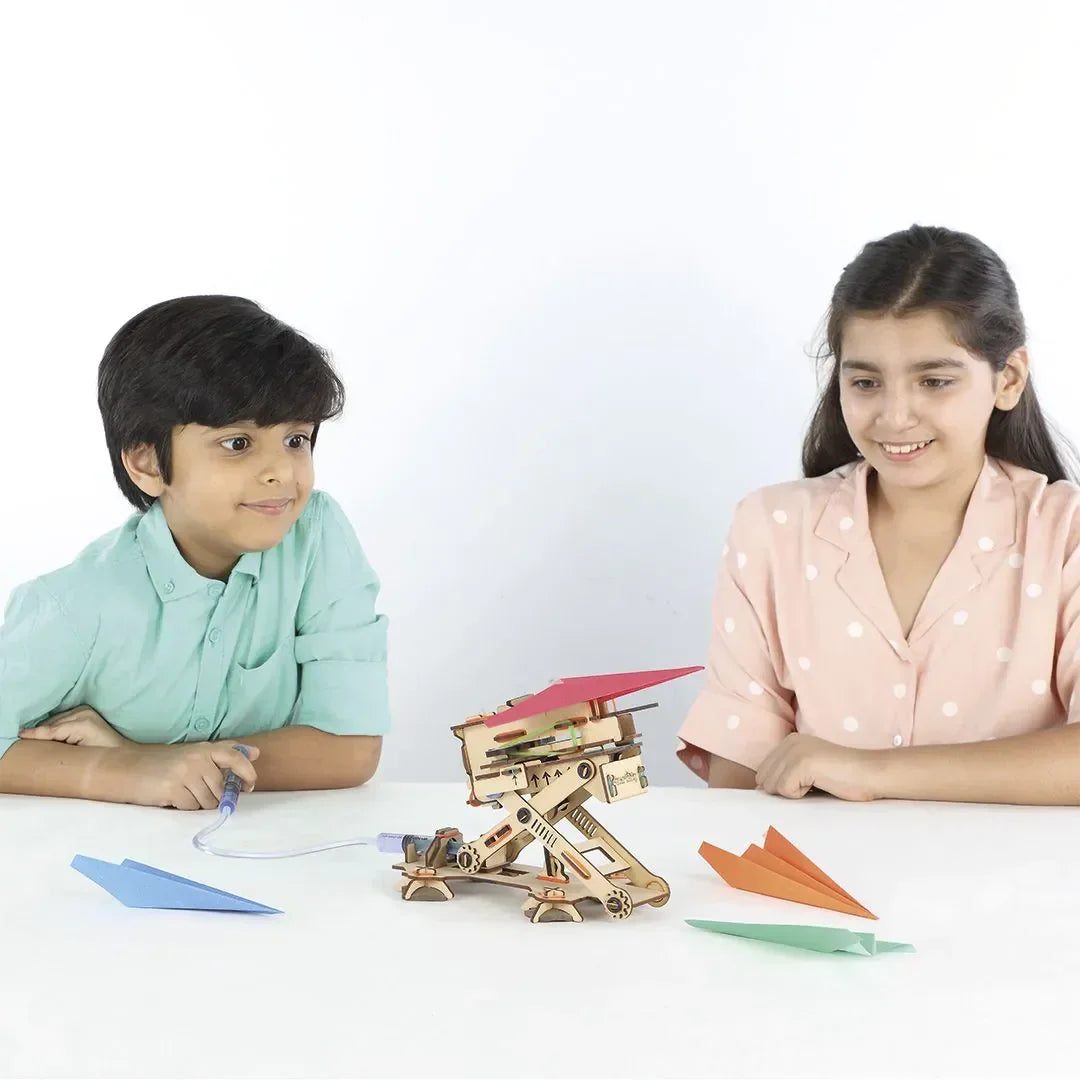 Schritt für Schritt entsteht aus lasergeschnittenen Holzkomponenten, Hydraulikspritzen, Schläuchen und Gummibändern ein echter Abschussmechanismus. Kein Kleber, keine Vorkenntnisse, kein Frust – nur die Freude am Bauen und am Ende das unvergessliche Gefühl, wenn der erste Papierflieger davonschießt. Kinder ab 6 Jahren können das Set eigenständig zusammenbauen, und wer möchte, gestaltet seinen Launcher anschließend mit Stiften und Farben ganz nach eigenem Geschmack.