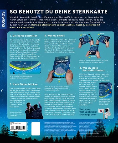 Drehen, schauen und erkennen – den Himmel erkunden mit der nachtleuchtenden und drehbaren Sternkarte. Wo steht der Große Wagen? Wann ist der Mars besonders gut zu sehen? Wo funkeln die Tierkreiszeichen? Die Sternkarte nimmt Kinder ab acht Jahren mit auf eine Entdeckungsreise am Himmel. Sie zeigt ihnen, wie sie sich am Sternenhimmel orientieren und gibt Tipps, um Sternzeichen und Sternbilder zu erkennen. Einfach den passenden Monat und die Uhrzeit einstellen und schon zeigt die Karte den aktuellen Sternenhimmel. Was ist in den Jahren 2023, 2024 und 2025 am Sternenhimmel los? Alle wichtigen Ereignisse auf einen Blick.