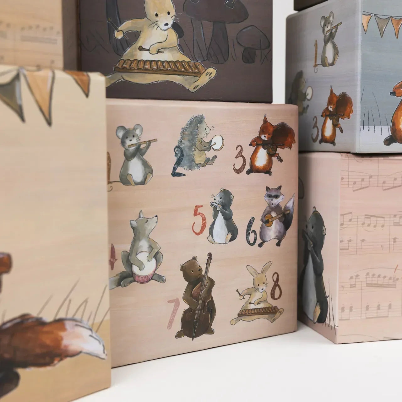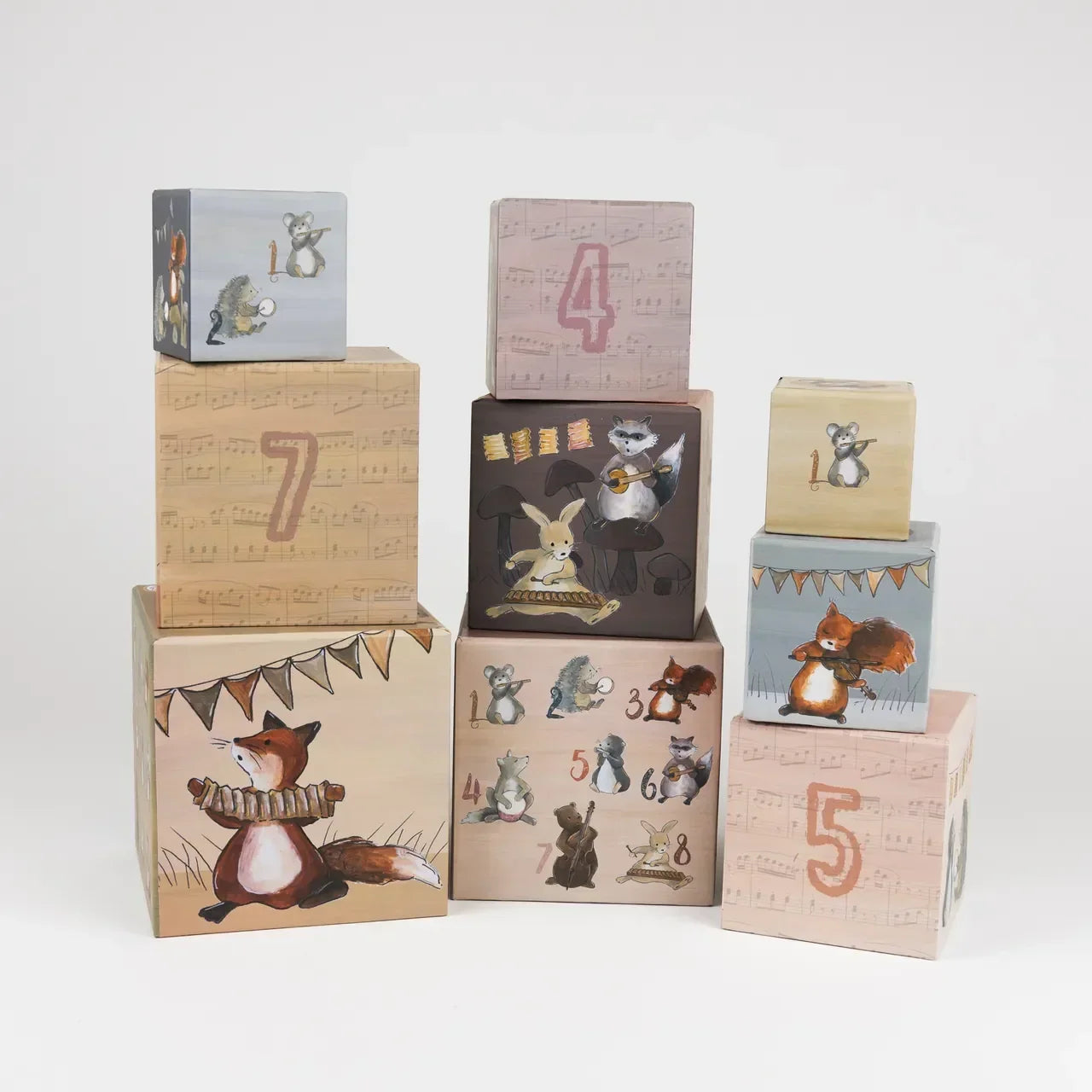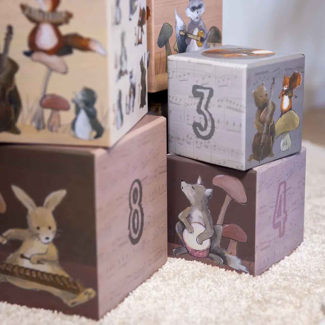 Neun bunte Würfel mit fröhlichen Tiermusikanten laden dazu ein, Stück für Stück eine Pyramide zu bauen, die am Ende fast einen ganzen Meter in die Höhe ragt. Für Hände, die gerade erst lernen, gezielt zu greifen und zu platzieren, ist das eine echte Herausforderung – und ein wunderbares Training für die Feinmotorik. Nebenbei lernen die Kleinen ganz selbstverständlich das Zählen, denn jeder neue Würfel ist einer mehr.