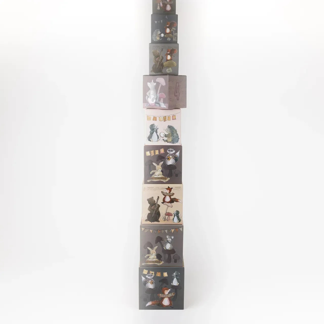 Das Besondere an diesem Stapelspiel: Die stabile Kartonbox, in der die Würfel aufbewahrt werden, ist selbst ein Stapelwürfel. Nichts geht verloren, alles hat seinen Platz, und aufgeräumt ist schnell. Die Würfel sind aus robustem Karton gefertigt, der auch neugierigen Kinderhänden standhält.